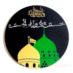 Celebrate your faith with the exquisite “Hussain Minni Wa Ana Minal Hussain” calligraphy wall art, featuring a profound Arabic inscription. This phrase, meaning “Hussain is from me and I am from Hussain,” highlights the deep bond between the Prophet Muhammad (Sallallahu Alaihi Wasallam) and his beloved grandson, Imam Hussain. This remarkable piece is crafted from high-quality black MDF wood, providing a striking backdrop for the radiant shrines. The depiction of Roza e Imam Hussain is rendered in a golden mirror acrylic sheet, while Roza e Hazrat Muhammad (Sallallahu Alaihi Wasallam) is beautifully crafted in green acrylic.