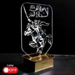 The “La Fata Illa Ali, La Saif Illa Zulfiqar Calligraphy Led Acrylic Lamp” is a masterpiece that pays homage to the bravery and valor of Hazrat Ali (A.S). This lamp features a golden mirror acrylic base paired with a transparent acrylic panel engraved with the iconic phrase “La Fata Illa Ali, La Saif Illa Zulfiqar,” meaning “There is no hero but Ali, no sword but Zulfiqar. This lamp features a golden mirror acrylic base and a transparent acrylic panel intricately engraved with the image of Hazrat Ali (A.S) riding a horse, holding the flag high. The design captures the essence of his bravery and devotion, making it a powerful symbol for believers. Equipped with dual-color LED lights (red and green), this lamp illuminates the detailed artwork, creating a striking visual effect. The 2.2 mm transparent acrylic ensures that every line and detail of the engraving is visible, making it a compelling piece for those who admire Hazrat Ali ibn Abi Talib.