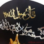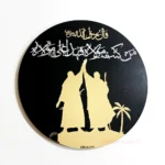 Enhance your home or office decor with this exquisite “Man Kunto Maula Fahaza Aliyun Maula” round calligraphy wall art. Crafted with precision, the piece features an MDF wood backing and is adorned with golden and silver mirror acrylic sheets, creating a striking contrast that highlights the beautiful Arabic calligraphy. Measuring 15×15 inches, this wall art captures a significant moment with two figures holding hands, symbolizing unity and leadership, accompanied by a serene palm tree. This piece is not only a testament to fine craftsmanship but also a profound representation of spiritual heritage.