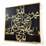 Surrounding this central text are the revered names of Panjtan Paak, gorgeously scripted in golden acrylic, adding an aura of elegance and spirituality to any space. This masterpiece seamlessly blends traditional Islamic artistry with modern design, making it a perfect addition to your home décor collection or a thoughtful gift for loved ones.