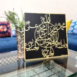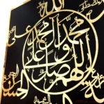Elevate the ambiance of your home with our exquisite Golden Arabic Calligraphy Home Décor piece. Crafted with precision and care, this stunning artwork features a circular arrangement of Arabic text, with the central focus on the sacred phrase “Allahumma Salli ‘Ala Muhammadin Wa Ali Muhammadin” (اللّهُمَّ صَلِّ عَلَى مُحَمَّدٍ وَآلِ مُحَمَّدٍ) beautifully engraved on black MDF sheet, encased in golden mirror acrylic sheets.